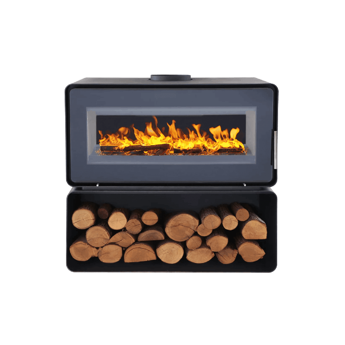 The Flamm freestanding range boasts an elegant and modern design, rotatable fireplace on log base stand with ashpan and door with handle .