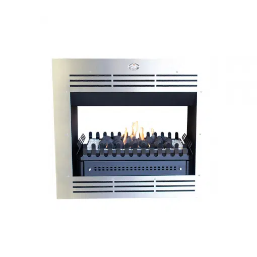 - Built-in 940 Double Sided Firebox Vent Free Stainless Steel Faced Fire box comes with a gas “coal grate”.