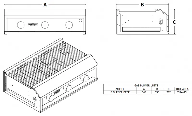 Jetmaster 3 burner deep Gas Braai Insert / Counter top features include: