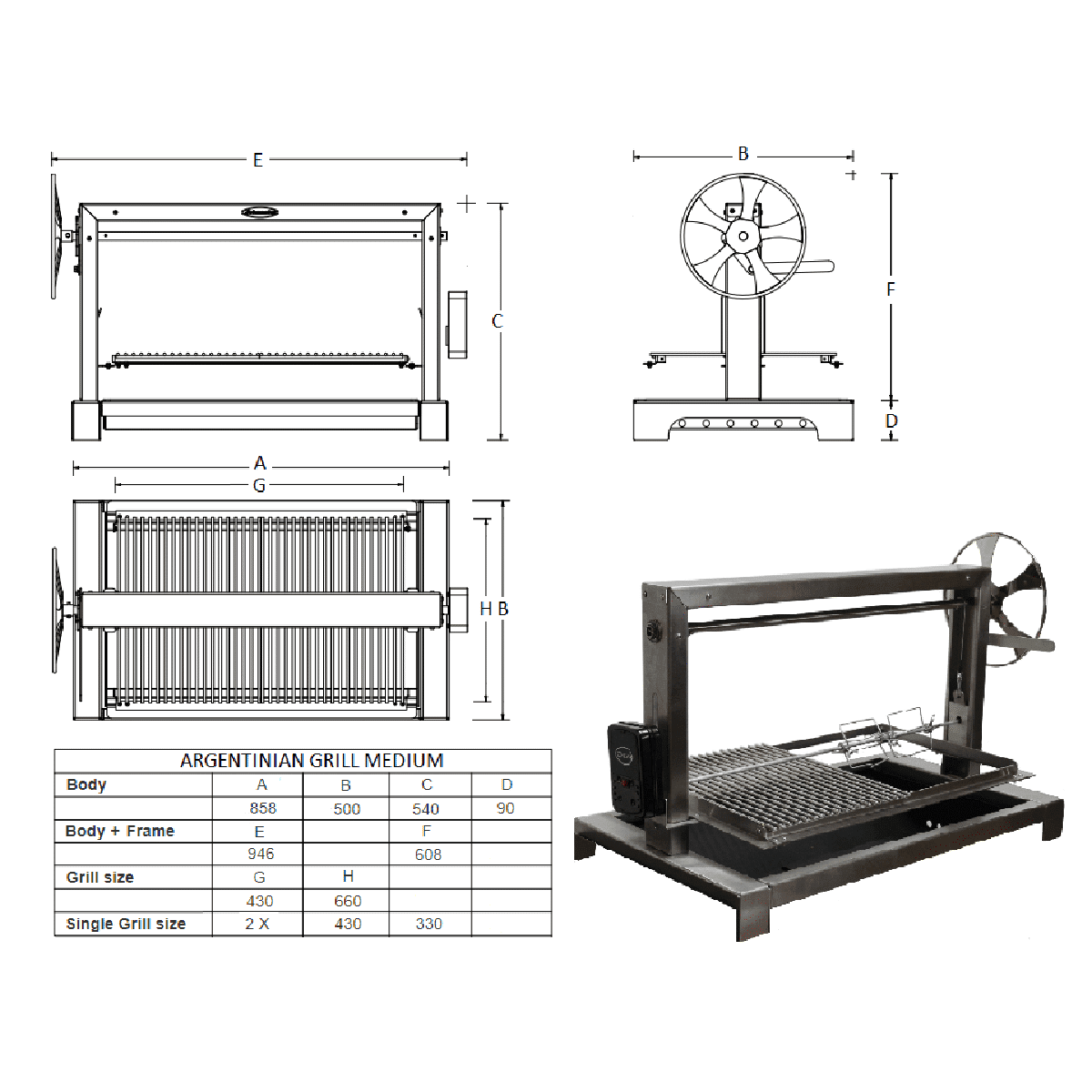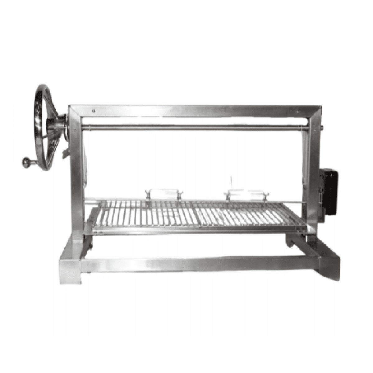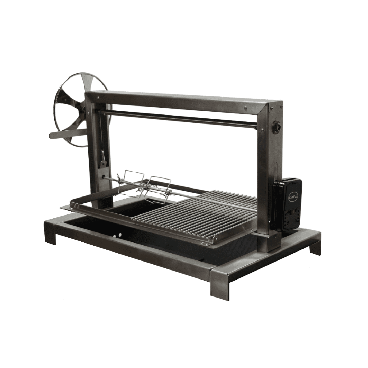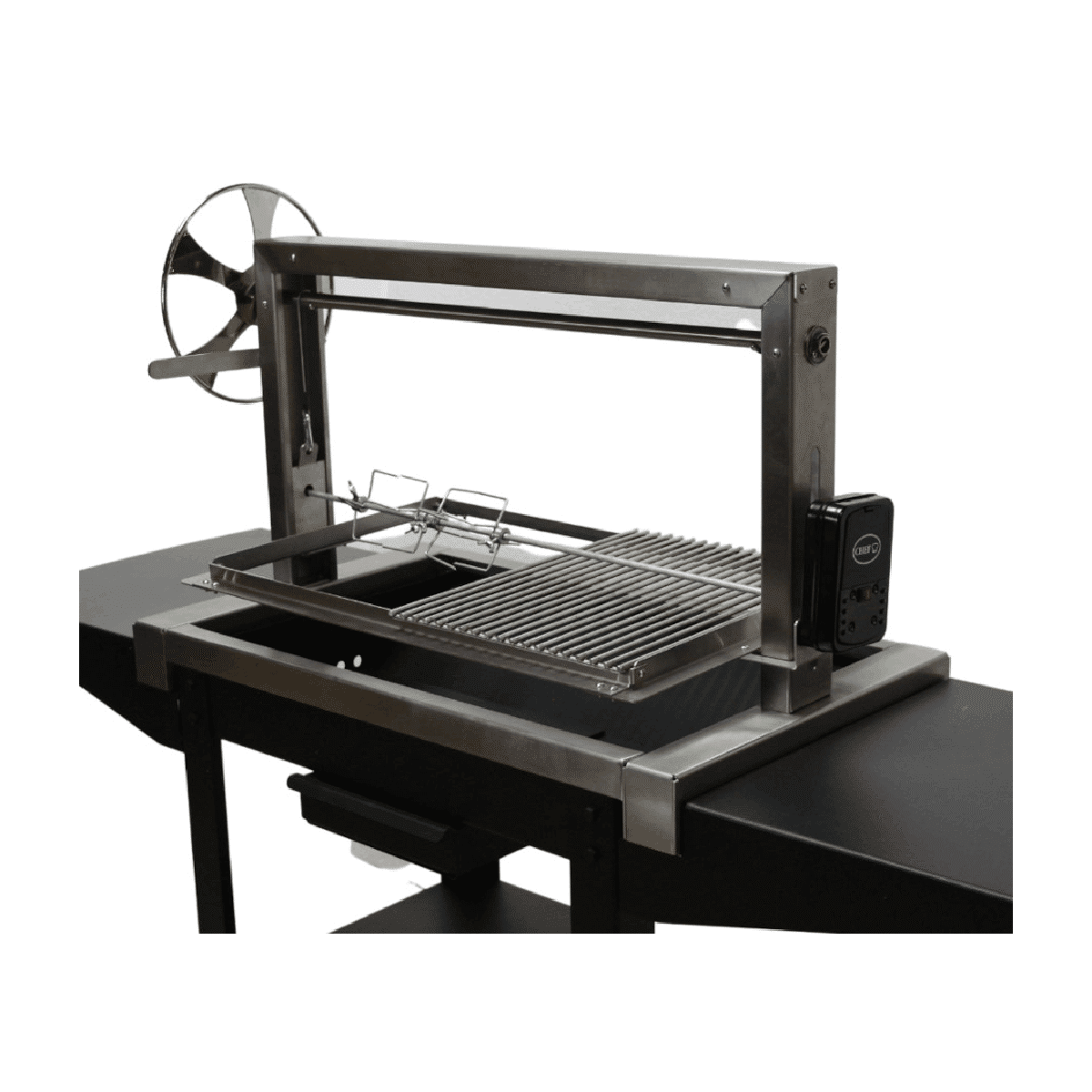 - Stainless-steel grill grid frame suspended from a wind-up stainless-steel crossbar using two stainless-steel heavy duty mini-cables to manually adjust for easy setting of optimal grilling heights.