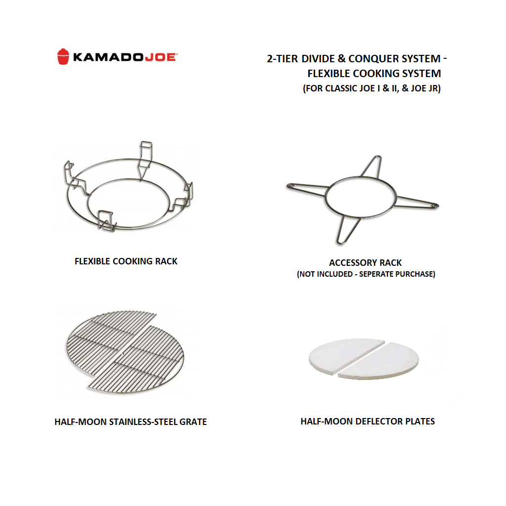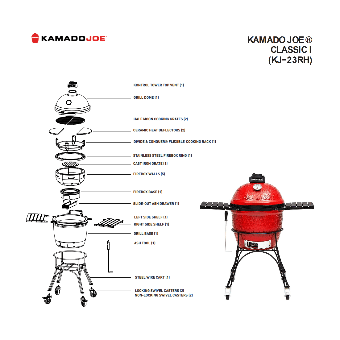 The Kamado Joe Classic I has been crafted to bring ease and sophistication to charcoal grilling. With innovative features made to create a seamless culinary experience, Kamado Joe Classic Joe® I is ready for every aspiring cook. With features such as the Slide-Out Ash Drawer for easy ash removal and cleaning, and the 2-Tier Divide & Conquer® Cooking System for cooking various foods at various temperatures, the Classic Joe I Grill is ideal for those who crave an easy-to-use, top-of-the-line product. The Classic Joe I has all the features and accessories listed below as standard.